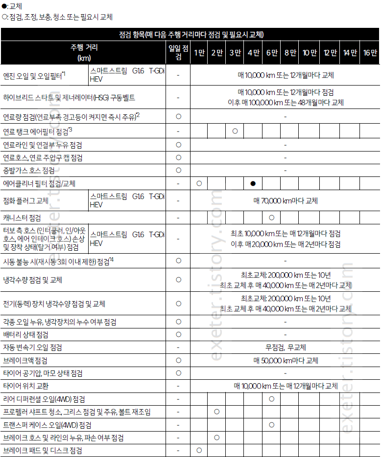 - 엔진 오일 및 오일필터 (G1.6 T-GDi HEV): 매 10,000km 또는 12개월마다 교체