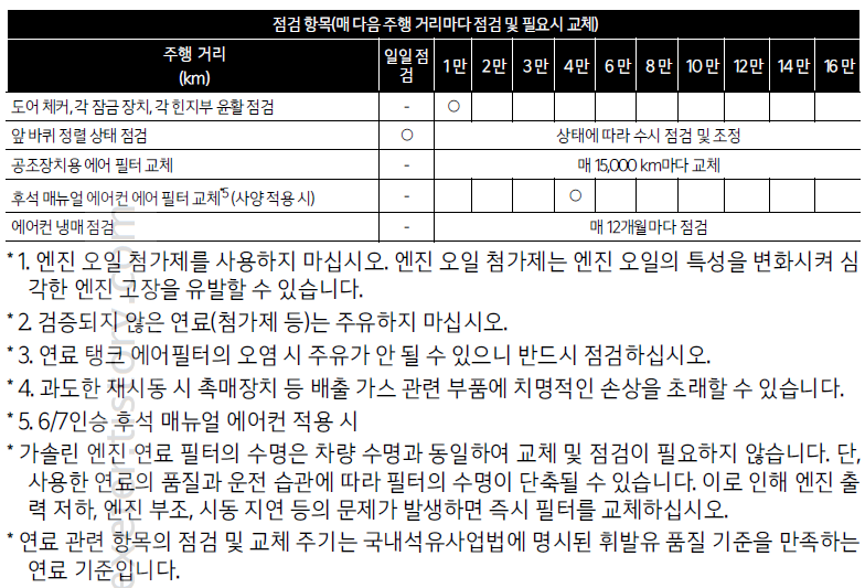 * 연료 관련 항목의 점검 및 교체 주기는 국내석유사업법에 명시된 휘발유 품질 기준을 만족하는연료 기준입니다.
