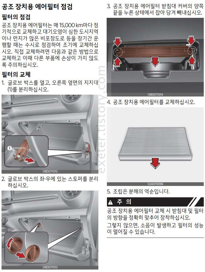 필터의 점검 공조 장치용 에어필터는 매 15,000 km마다 정기적으로 교체하고 대기오염이 심한 도시지역이나 먼지가 많은 비포장도로 등을 장기간 운 행할 때는 수시로 점검하여 조기에 교체하십시오.