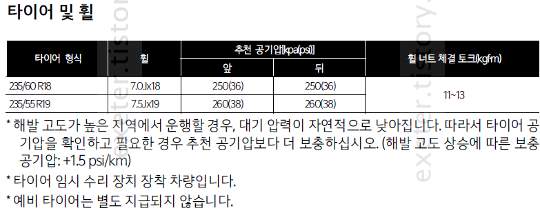 타이어 추천 공기압: 240 kPa (35 psi) *18인치