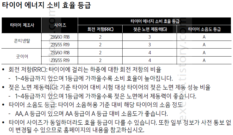 *타이어 순정 사이즈 및 에너지 소비 효율 등급(젖은노면 제동력)은 아래 그림 참고