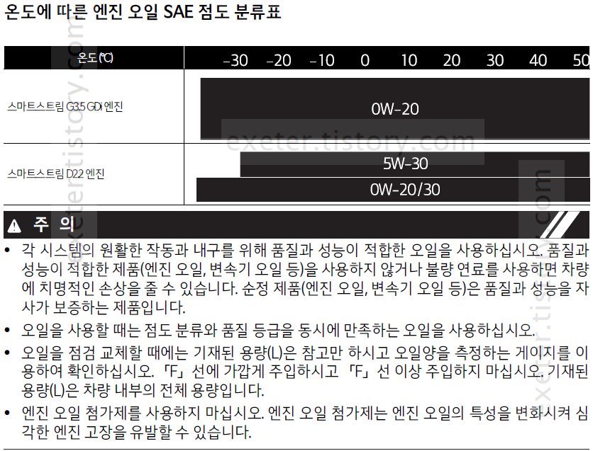 -오일을 사용할 때는 점도분류와 품질 등급을 동시에 만족시키는 오일을 사용하십시오.