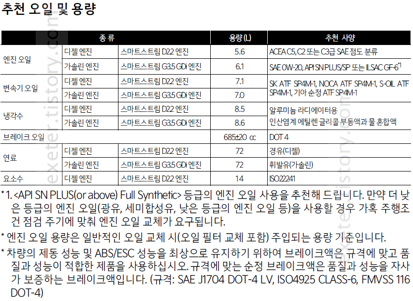 - 엔진 오일 (가솔린 G3.5 GDi 엔진): 6.1 리터 (SAE 0W-20, API SN PLUS/SP 또는 ILSAC GF-6 *1)