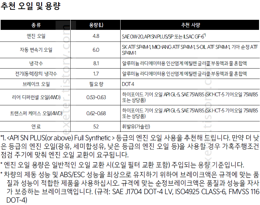 *1. <API SN PLUS(or above) Full Synthetic > 등급의 엔진 오일 사용을 추천해 드립니다. 만약 더 낮은 등급의 엔진 오일(광유, 세미합성유, 낮은 등급의 엔진 오일 등)을 사용할 경우 가혹주행조건 점검 주기에 맞춰 엔진 오일 교환이 요구됩니다.