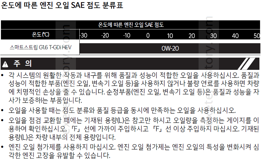 - 엔진 오일 (G1.6 T-GDi HEV): 4.8 리터 (SAE 0W-20, API SN PLUS/SP 또는 ILSAC GF-6 *1)