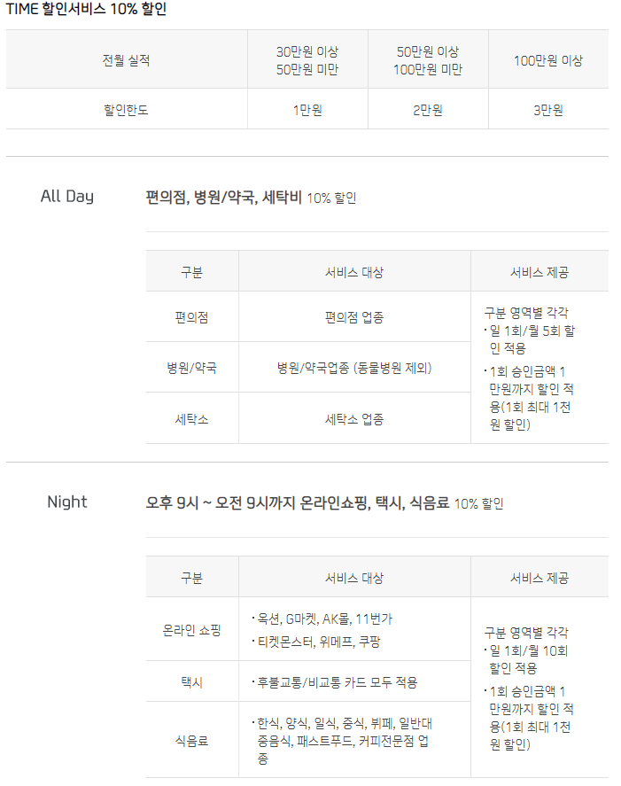 365일 24시간 10% 할인서비스 (편의점, 병원/약국, 세탁소 업종 => 월 5회)