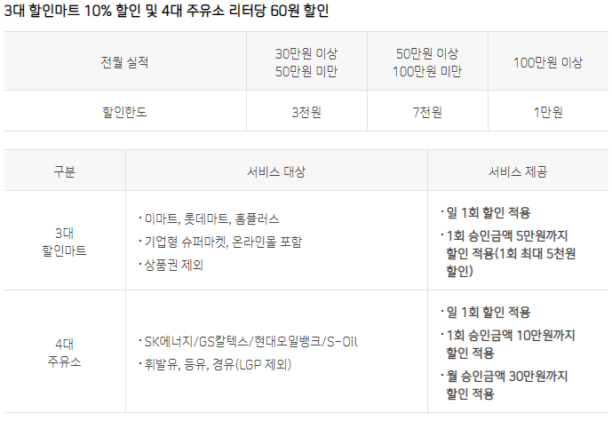 * 신규 발급 회원에 대해서는 카드 사용 등록월의 익월말(등록월+1개월)까지 전월실적 30~50만 원 구간의 할인한도 제공