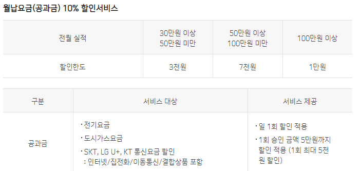 매월 나가는 월납요금(공과금) 10% 할인 (하루 1회, 회당 최대 5천원)