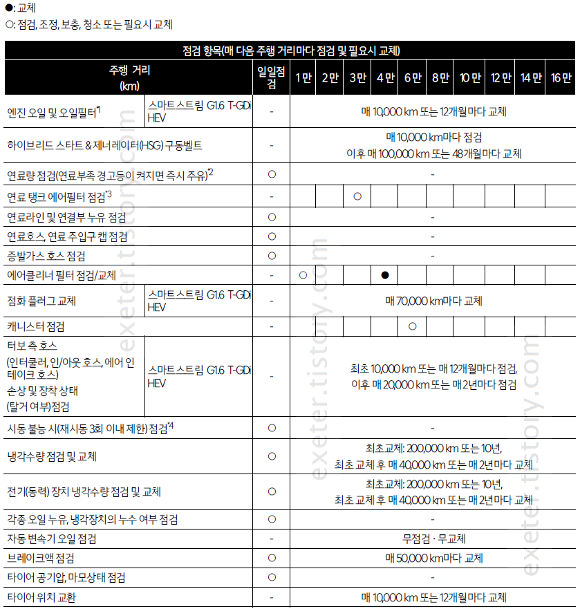 예를 들어, 가혹 조건인 경우에는 가솔린 하이브리드 G1.6 T-GDi HEV 엔진 오일은 '매 5000 Km 또는 6개월' 마다 교체로 안내하고 있습니다. 가혹 조건인 경우 일반적인 운행조건 대비 점검/교체 주기가 더 짧습니다.