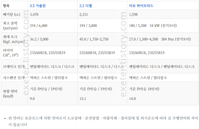 | 항목 | 3.5 가솔린 | 2.2 디젤 | 터보 하이브리드 |