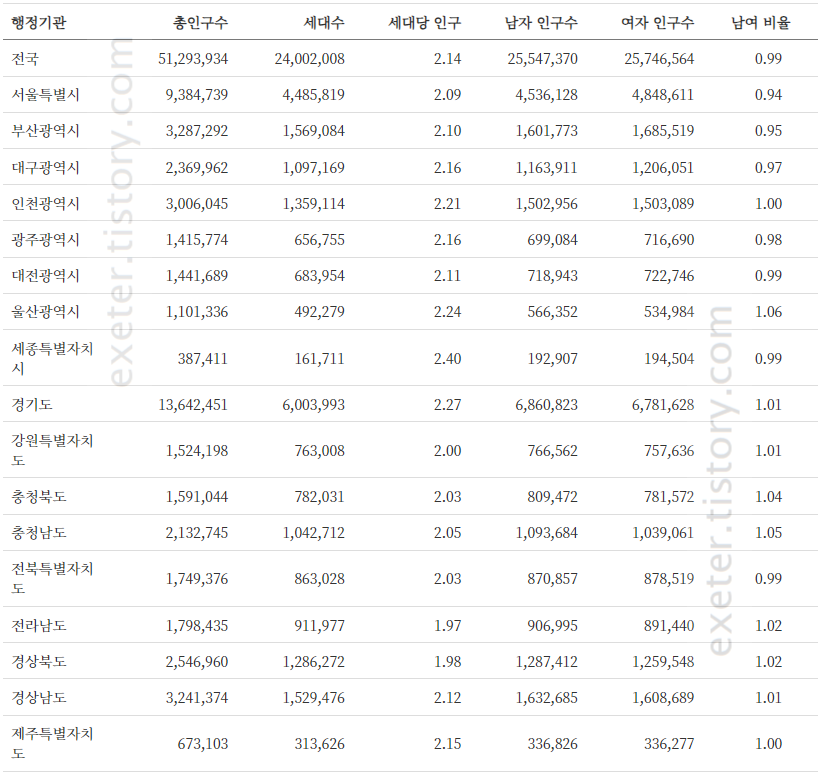 | 전국 | 51,293,934 | 24,002,008 | 2.14 | 25,547,370 | 25,746,564 | 0.99 |