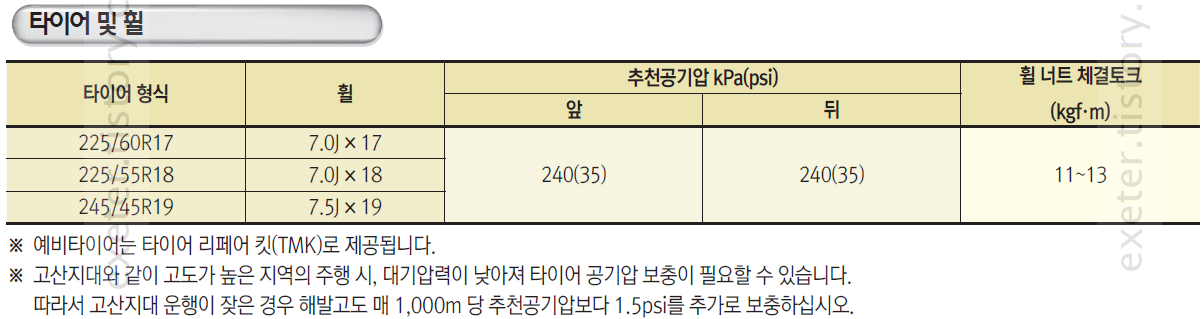 - 한국: 225/60R17 99H, 245/45R19 98H