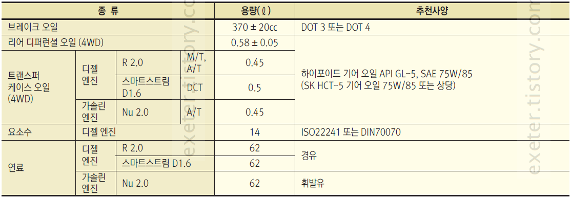 - 냉각수 (디젤/ R2.0 ): 8.4 리터 (인산염계 에틸렌글리콜 성분 알루미늄 라디에이터용 부동액과 물 혼합액)