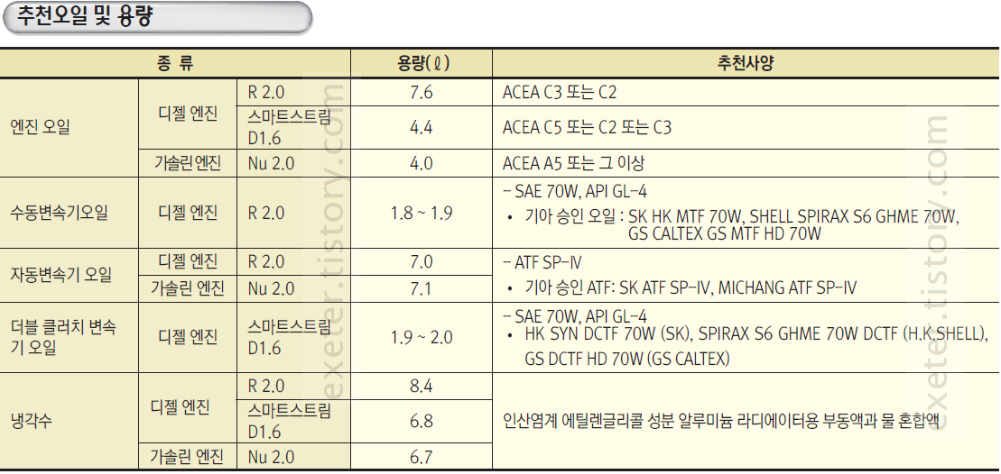 - 엔진 오일 (디젤 / R2.0): 7.6 리터 (ACEA C3 또는 C2)