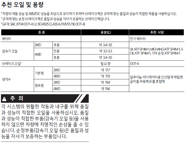 - 브레이크 오일*: 필요량 (DOT-4)