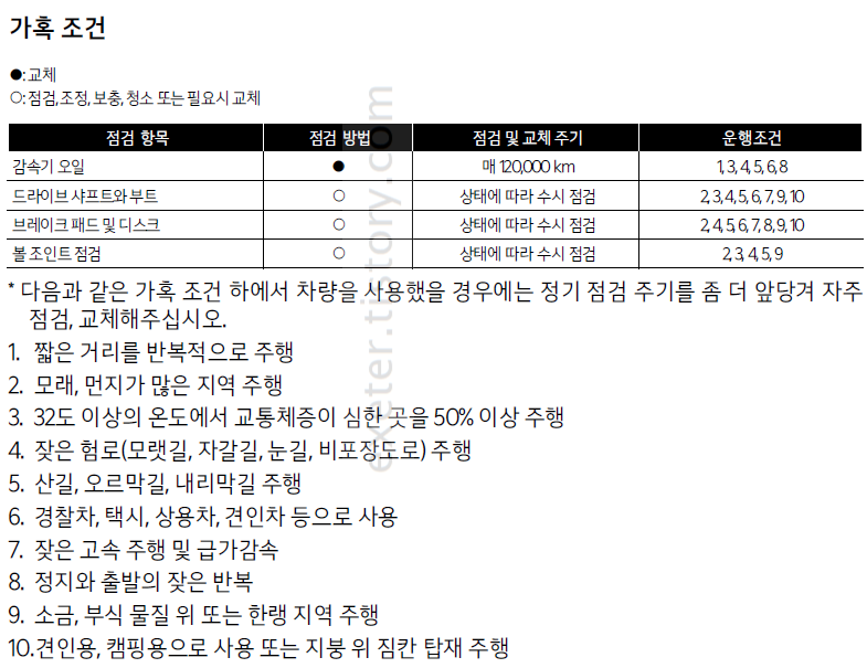 차량 사용 설명서에서는 '가혹 조건'인 경우 교환/점검 주기를 빠르게 가져가도록 안내하고 있습니다.
