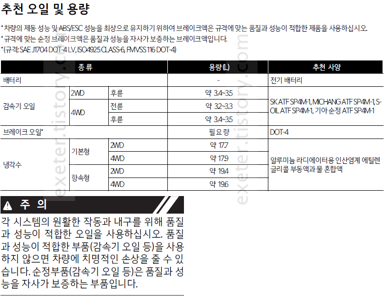 - 감속기 오일 (4WD / 전륜): 약 3.2~3.3 리터 (상동)