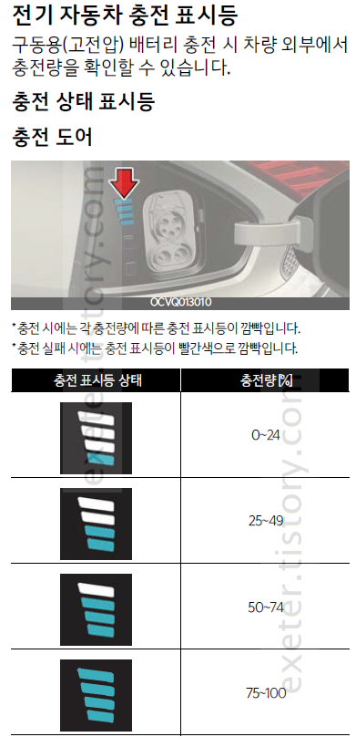 구동용(고전압) 배터리 충전 시 차량 외부에서충전량을 확인할 수 있습니다.