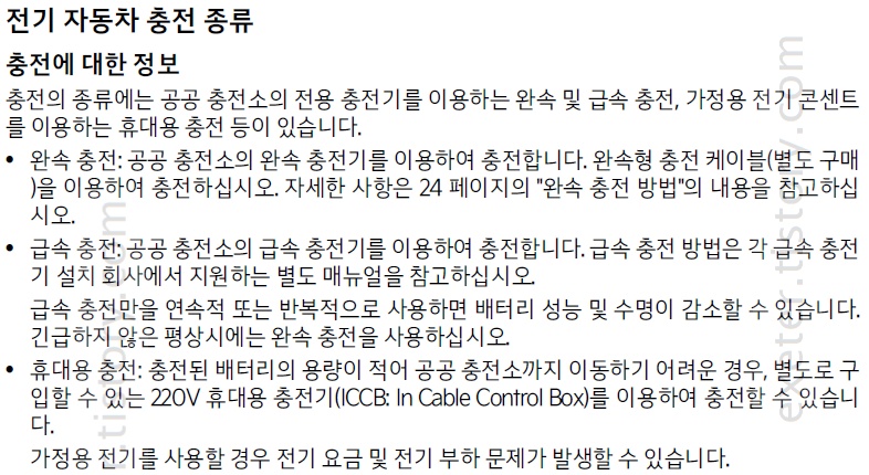 - 휴대용 충전: 충전된 배터리의 용량이 적어 공공 충전소까지 이동하기 어려운 경우, 별도로 구입할 수 있는 220V 휴대용 충전기(ICCB: In Cable Control Box)를 이용하여 충전할 수 있습니다.