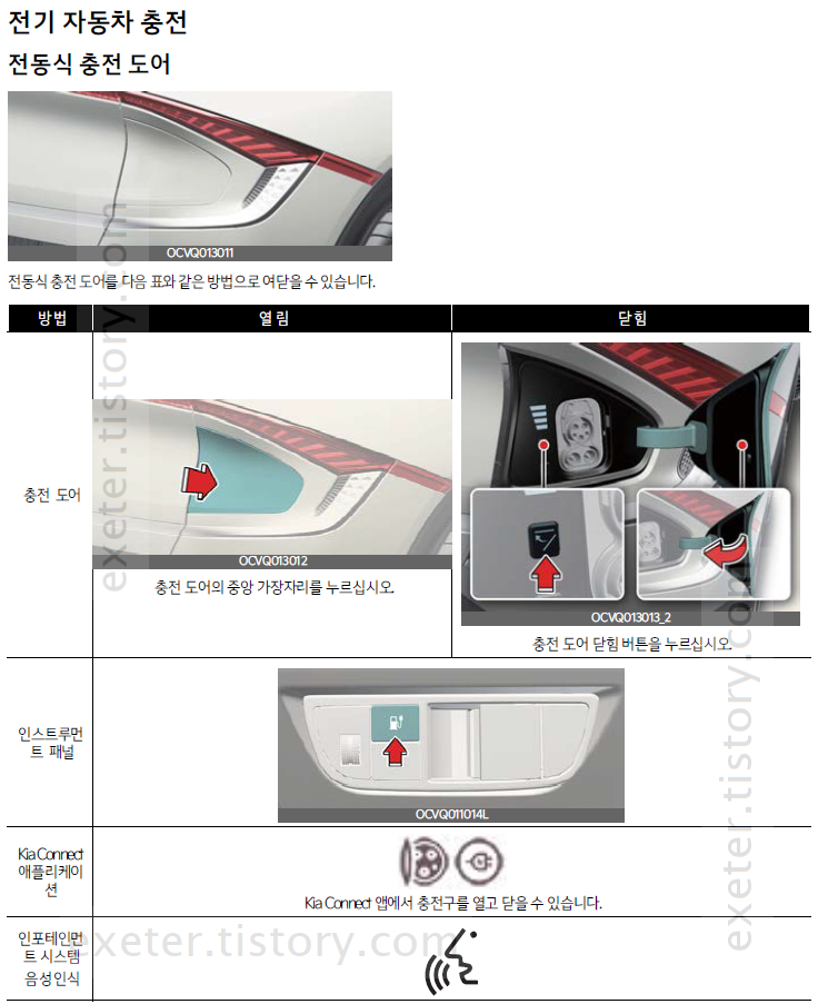 3. 충전 도어의 패널을 눌러 충전 도어를 여십시오. 충전 도어 여는 다른 방법 및 자세한 사항은 21 페이지의 "전동식 충전 도어"의 내용을 참고하십시오. (본 글 상단 내용 참조 하세요)