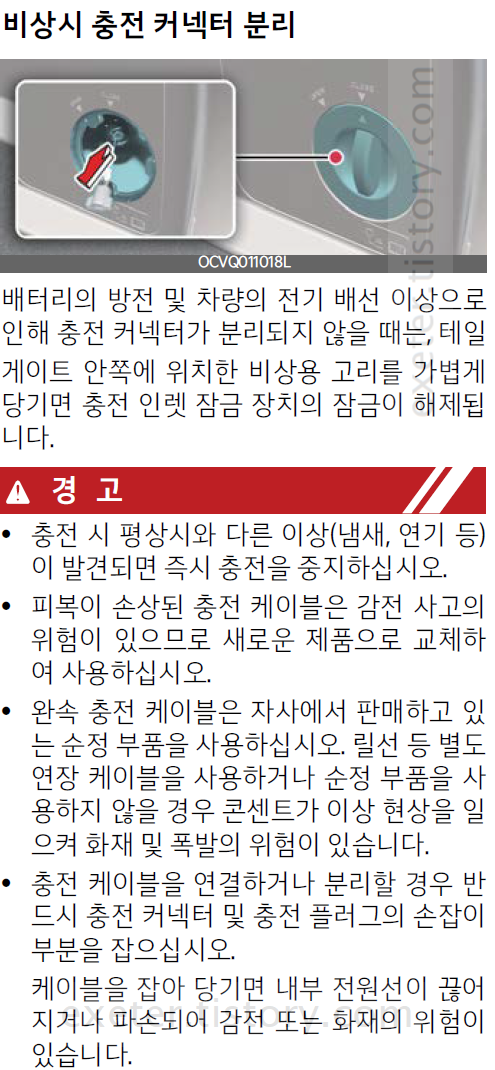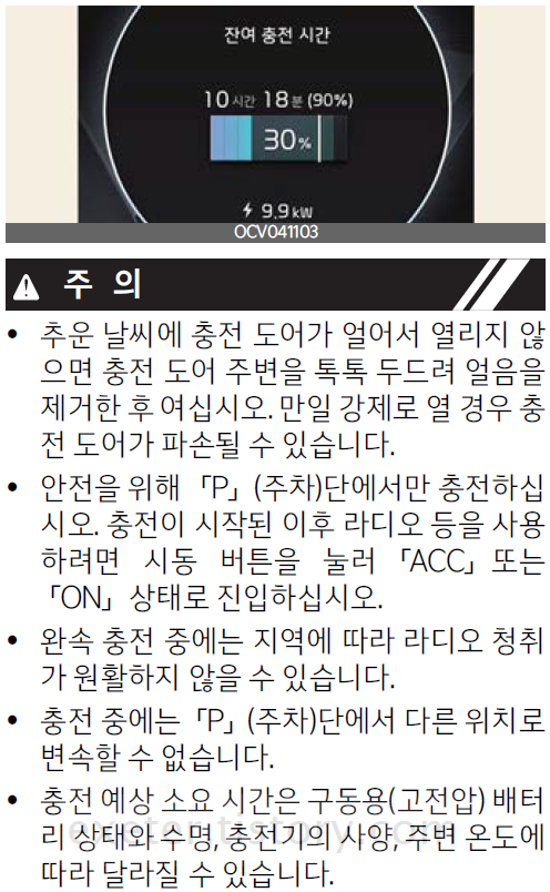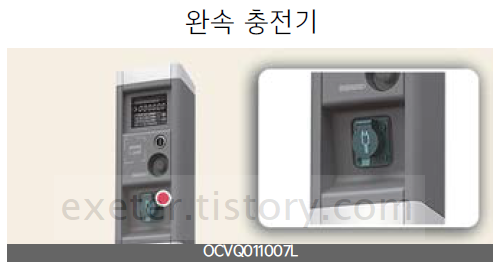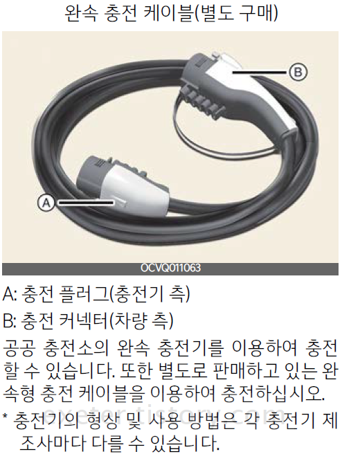 - 완속 충전 케이블은 자사에서 판매하고 있는 순정 부품을 사용하십시오. 릴선 등 별도 연장 케이블을 사용하거나 순정 부품을 사용하지 않을 경우 콘센트가 이상 현상을 일으켜 화재 및 폭발의 위험이 있습니다.