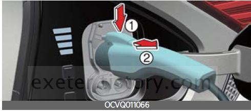 2. 충전 커넥터 손잡이 부분을 잡고 잠금 해제 버튼(1)을 누르면서 당겨(2) 분리하십시오.