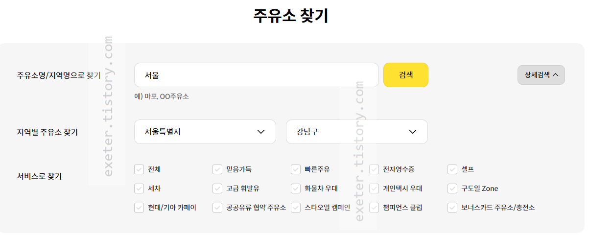 예를 들어, 아래와 같이 서울, 강남구 선택 후 [검색] 클릭하면 해당 지역의 'S-OIL주유소' 정보를 일괄로 볼 수 있습니다. (세차/믿음가득/셀프/고급 휘발유 등 옵션 선택 가능)