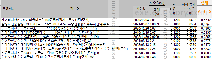 지난번 2024년 7월 조사결과에서는 삼성자산운용 '삼성KODEX미국나스닥100TotalReturn증권상장지수투자신탁' 이 가장 저렴한 수수료 합계 0.1715% 였으나, 오늘 조사한 결과로는 KB자산운용의 상품인 'KBRISE미국나스닥100증권상장지수투자신탁'이 아주 작은 차이 (약 0.002%)로 가장 저렴한 수수료를 보이고 있습니다.