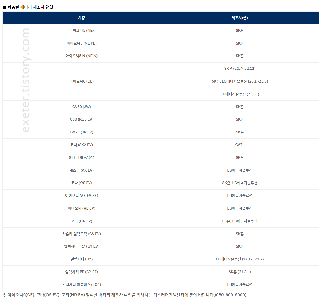 ※ 아이오닉6(CE), 코나(OS EV), 포터(HR EV) 정확한 배터리 제조사 확인을 위해서는 커스터머컨택센터에 문의 바랍니다.(080-600-6000)