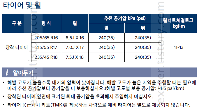 - 타이어 형식: 205/65 R16, 215/55 R17, 235/45 R18