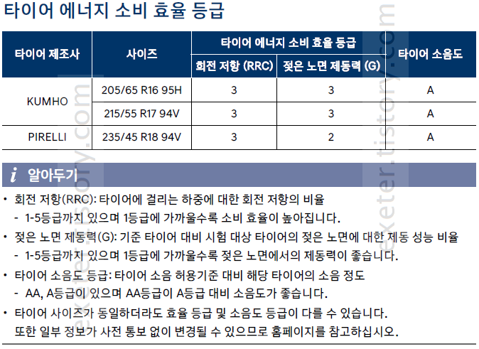타이어 순정 사이즈 및 에너지 소비 효율 등급은 아래 참조