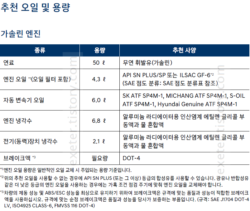 아래 엔진오일/변속기 오일/냉각수/브레이크 오일/연료 용량 등 각종 오일류의 용량(단위: L) 및 추천사양을 참고하시기 바랍니다.