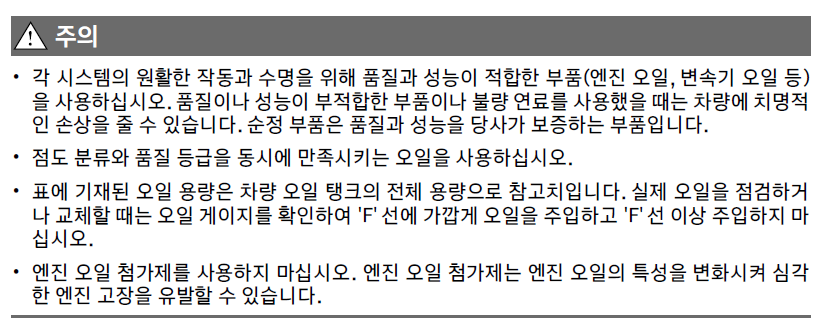 • 표에 기재된 오일 용량은 차량 오일 탱크의 전체 용량으로 참고치입니다. 실제 오일을 점검하거나 교체할 때는 오일 게이지를 확인하여 'F' 선에 가깝게 오일을 주입하고 'F' 선 이상 주입하지 마십시오.