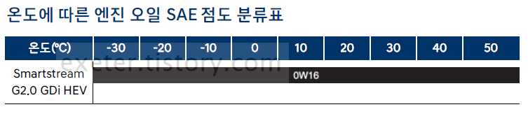 아래는 2025 쏘나타 HEV '온도에 따른 엔진 오일 SAE 점도 분류표'입니다.