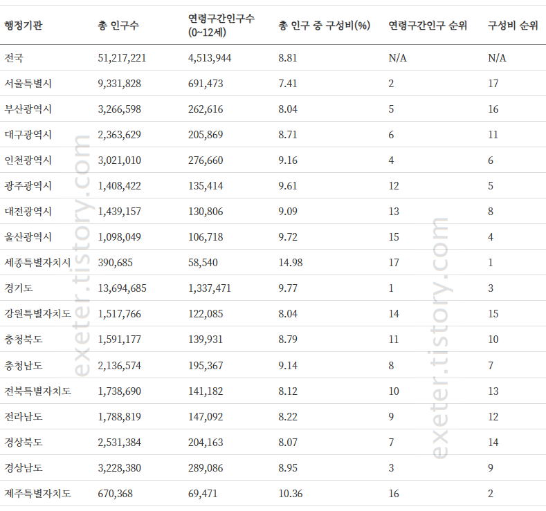 우리나라 아동 인구 현황을 직접 조사하여, 각 행정 구역/도시 별 아동(0세~12세) 인구 구성비 등을 표로 정리하였습니다.
