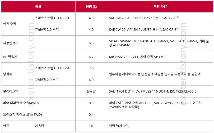 | 엔진 오일 | 스마트스트림 G 1.6 T-GDi | 4.8 | SAE 0W-20, API SN PLUS/SP 또는 ILSAC GF-6*1 |
