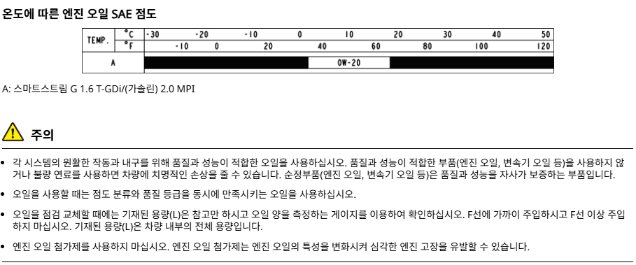 | (가솔린) 2.0 MPI | 4.0 | SAE 0W-20, API SN PLUS/SP 또는 ILSAC GF-6*1 | |