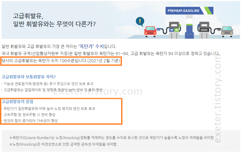 고급휘발유 관련하여 현대오일뱅크 홈페이지에서 안내하는 내용을 발췌, 정리하였습니다. exeter.tistory.com> (자료 출처: 현대오일뱅크 홈페이지) Q. 고급 휘발유는 일반 휘발유와 무엇이 다른가?