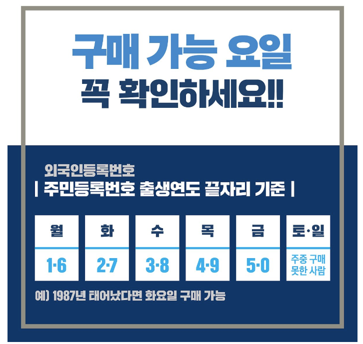 즉, 자신에게 해당하는 평일 중 구매 못하신 분은 토요일/일요일에 구매 가능합니다. 그리고 다시 다음 주 월요일부터 해당 요일에 구매 가능합니다. 반대로 평일에 구매하신 분은 주말에 구매 불가합니다. (인당 매주 2매 제한) 또한, 가족이라도 성인 각자 신분증 필요합니다.
