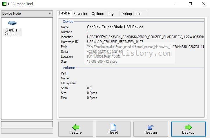 2) 오른쪽 [Device] 탭에서 선택한 드라이브의 정보 확인