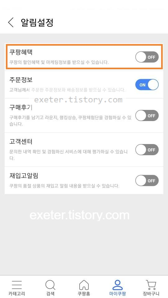 4) '알림설정' 화면에서 [쿠팡혜택] 선택 해제 (OFF)