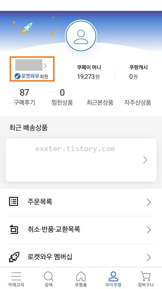 1) 먼저 쿠팡 앱을 실행, 하단 메뉴에서 [마이쿠팡] 선택