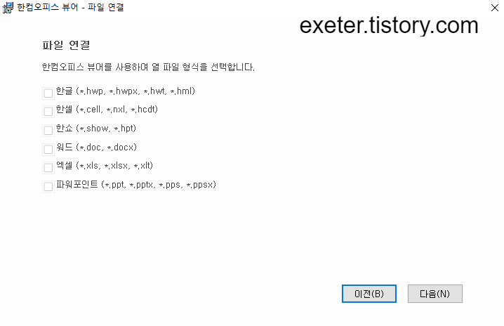 4) '파일 연결'에서, 뷰어로 사용하고자 하는 파일 확장자 선택 (마이크로소프트 오피스 등이 이미 설치되어 있다면 '한컴' 제품군만 선택 추천)
