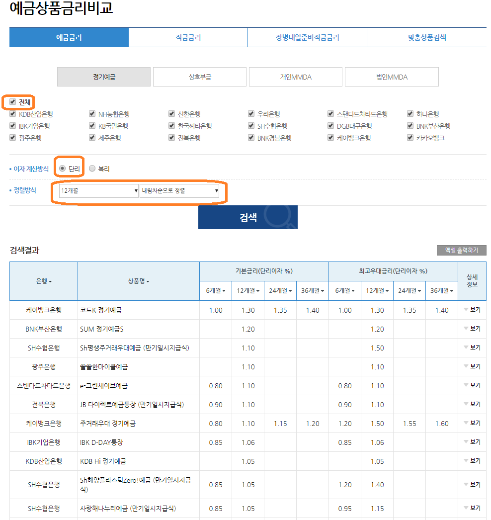 전국은행연합회 소비자포털에서는 일반 시중은행(제1금융권) 정기예금 금리와 적금금리를 비교하여 제공하고 있습니다.