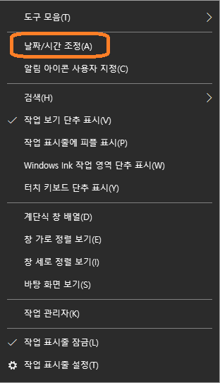 1) 우측 하단(작업표시줄) 시계에서 마우스 오른쪽 버튼 클릭