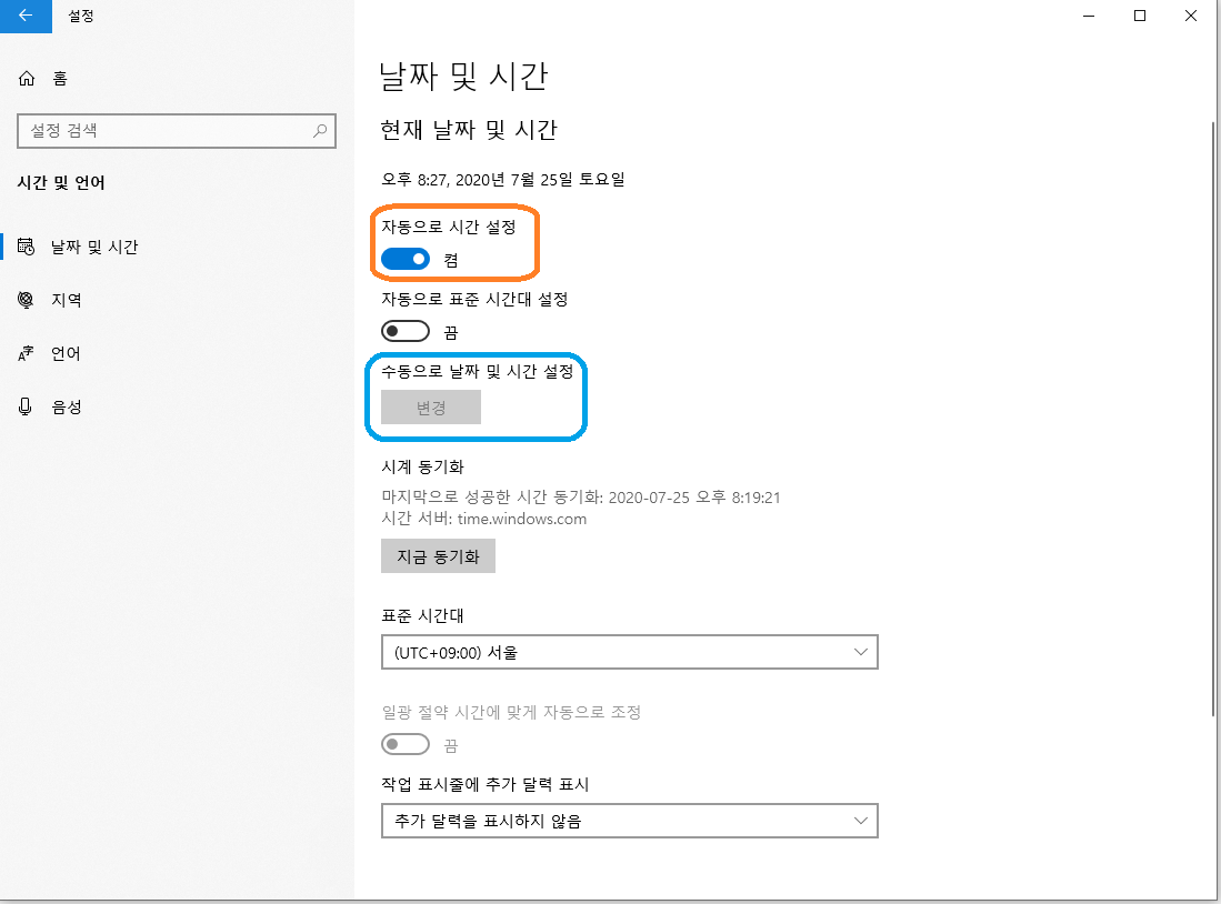 자동 시간 설정을 끄고 나면, [수동으로 날짜 및 시간 설정] 에서 [변경] 기능이 활성화 되고 선택 가능함.