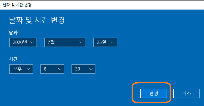 4) 아래와 같이 '날짜 및 시간 변경'창이 나타나면, 원하는 날짜와 시간을 입력하고 [변경] 선택.