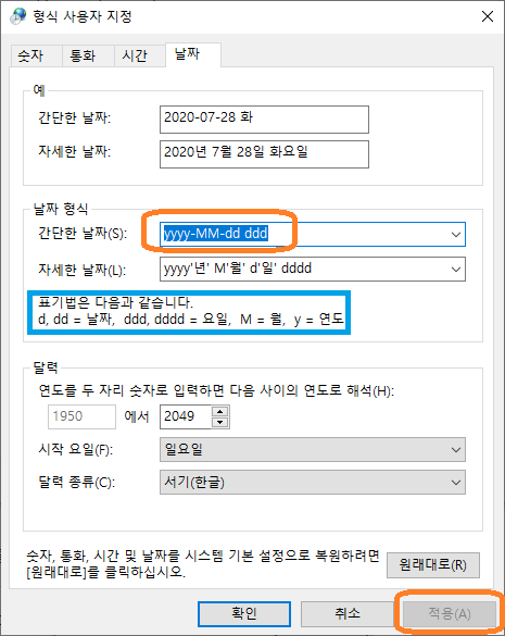 여기서 중요한 부분이 [간단한 날짜] 부분에 입력값을 변경하는 것입니다.