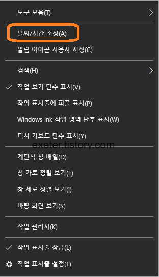 1) 오른쪽 아래 '시계'에서 마우스 우클릭 -> [날짜/시간 조정] 선택