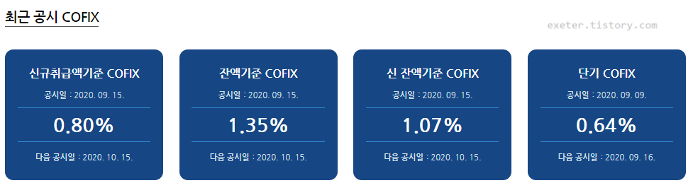 2020.09.15일 기준 코픽스(COFIX) 금리가 역대 최저치입니다.